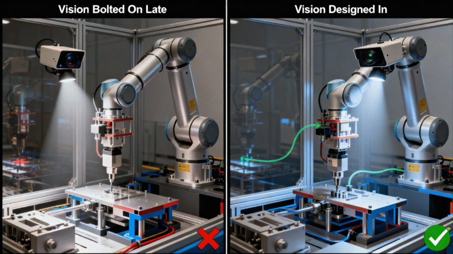 Vision systems and sensors are often added late as a “quality enhancement” instead of being designed into the cell from day one.